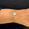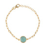 This bracelet is handcrafted with a natural amazonite gemstone set in 3 micron thick 18k gold-plated sterling silver. The gemstone is secured in a sleek bezel, linked by an extendable chain of paper clip shaped links, offering both elegance and comfort for everyday wear. Its clean design and classic stone setting make it versatile enough to wear alone or layered with other pieces.