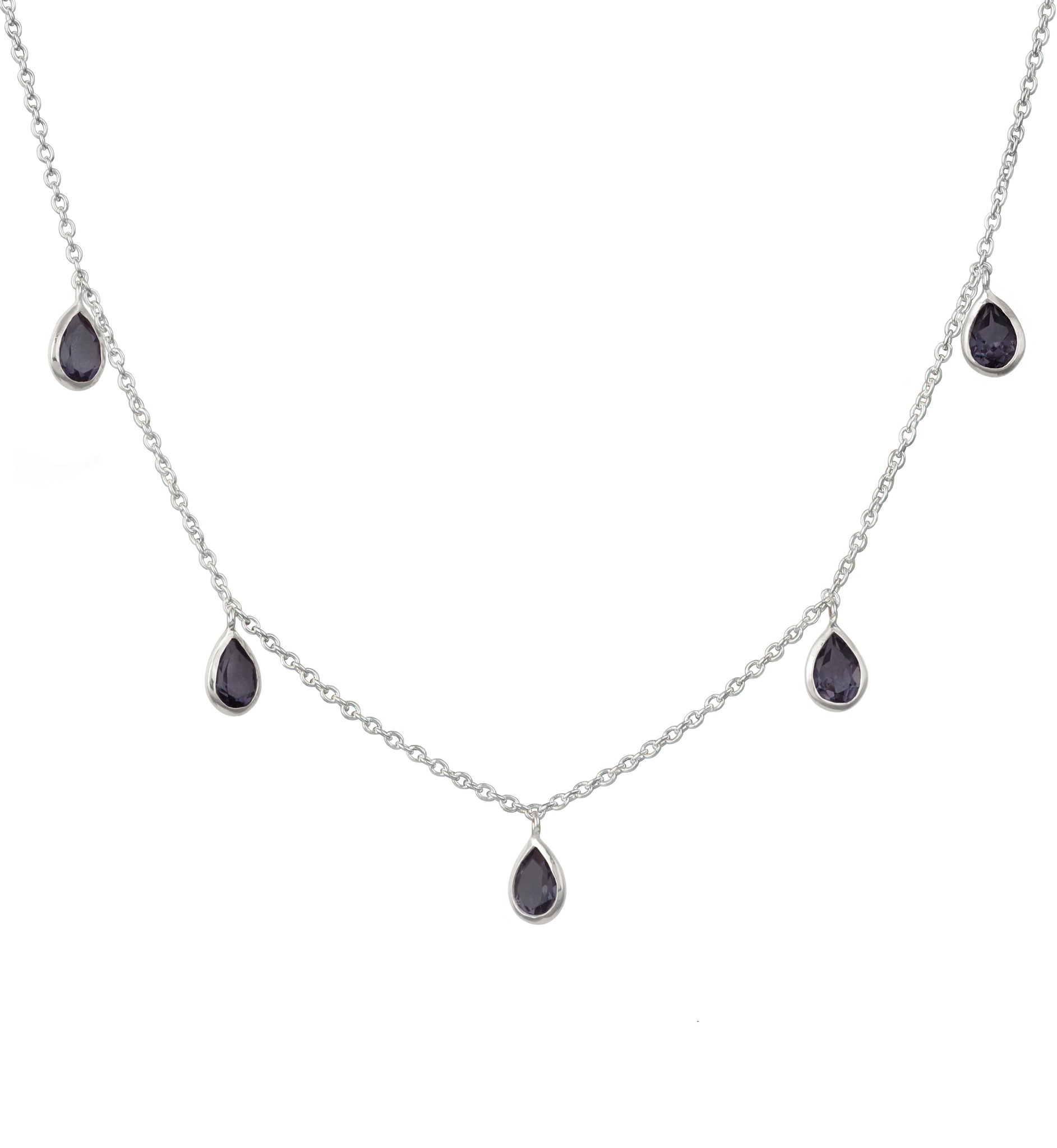This sterling silver necklace features five delicate gemstones cut in a teardrop shape and encased in a modern bezel setting, hanging at spaced intervals, on an adjustable chain for the perfect fit. Carefully handcrafted by artisans, the stones drop down and move effortlessly on the chain, making it ideal to wear on its own or layered with your other favourites. Also available in 18k gold plated silver and with other gemstones.