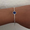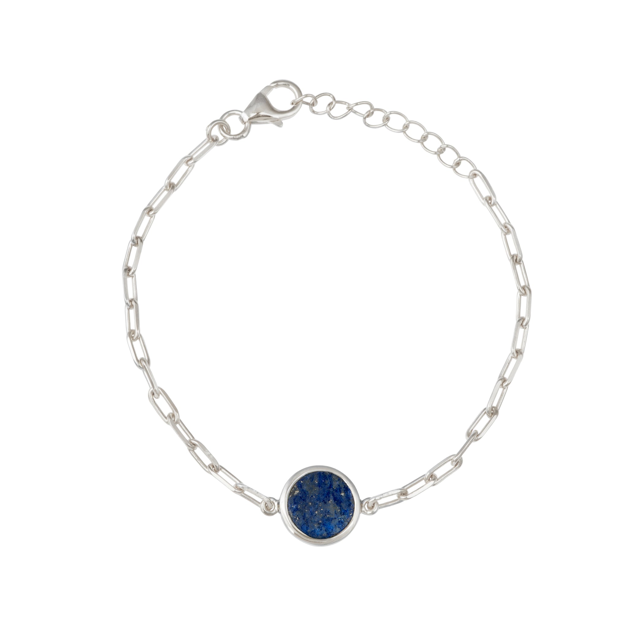 This bracelet is handcrafted with a natural Lapis Lazuli gemstone set in sterling silver. The gemstone is secured in a sleek bezel, linked by an extendable chain of paper clip shaped links, offering both elegance and comfort for everyday wear. Its clean design and classic stone setting make it versatile enough to wear alone or layered with other pieces.