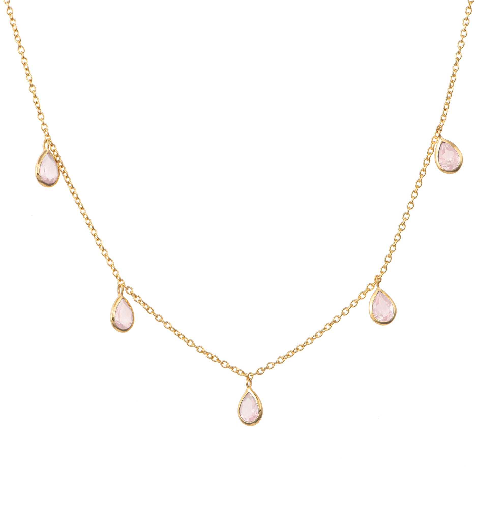 Five Teardrop Shaped Rose Quartz Gemstone Necklace in Vermeil Gold