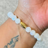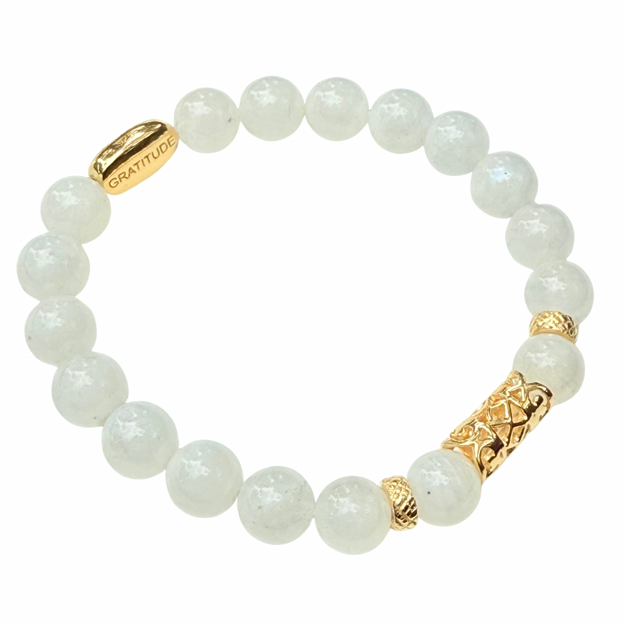 This Beaded Bracelet is hand-made with natural gemstones featuring an 18k gold-plated sterling silver ‘Gratitude’ charm and an ornate filigree spacer. The stones are threaded on strong elastic making the bracelet perfect for everyday wear. Beautiful on its own or also stacked with other gemstones. Also available in sterling silver.