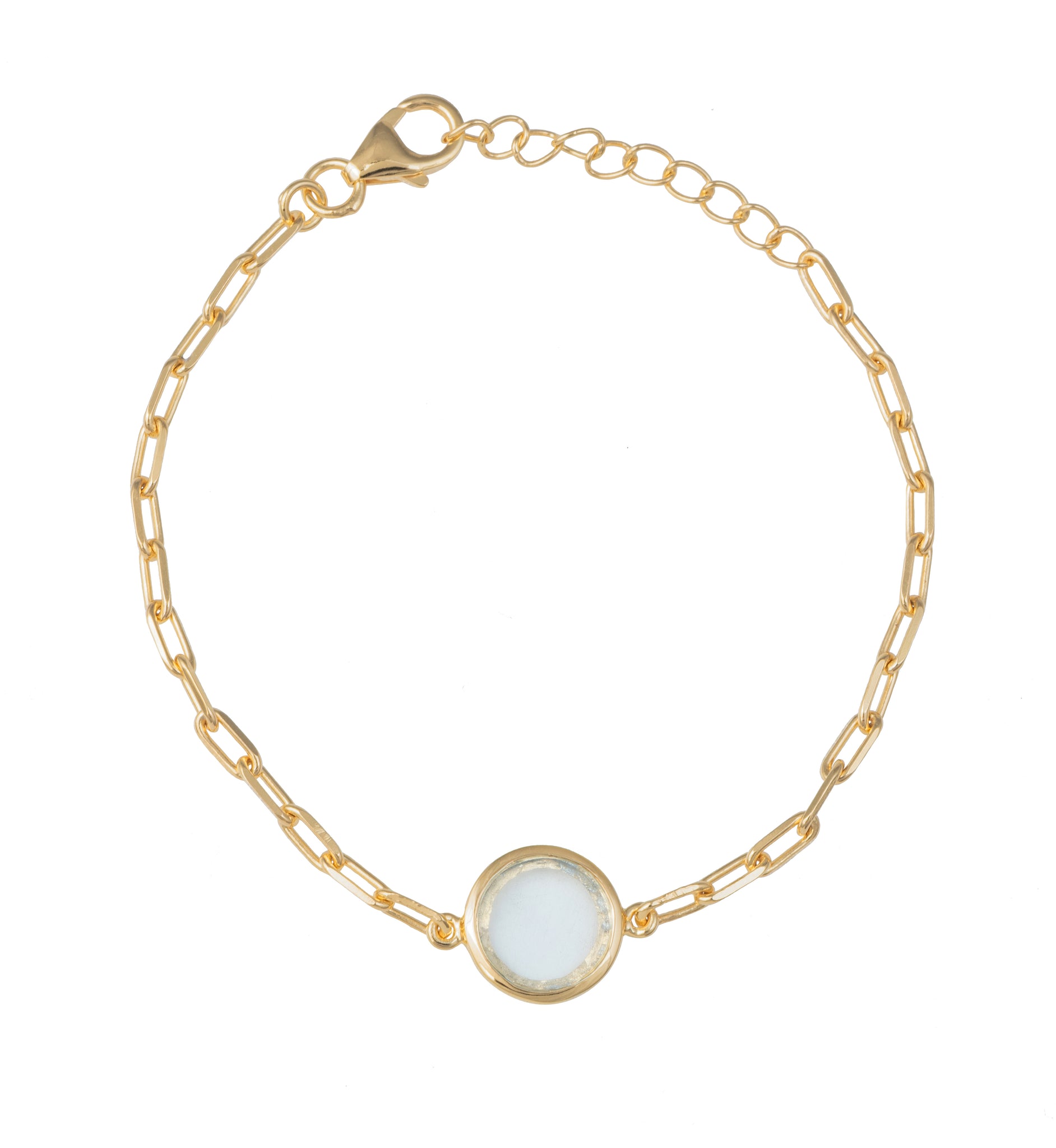 This bracelet is handcrafted with a natural blue topaz gemstone set in 3 micron thick 18k gold-plated sterling silver. The gemstone is secured in a sleek bezel, linked by an extendable chain of paper clip shaped links, offering both elegance and comfort for everyday wear. Its clean design and classic stone setting make it versatile enough to wear alone or layered with other pieces.