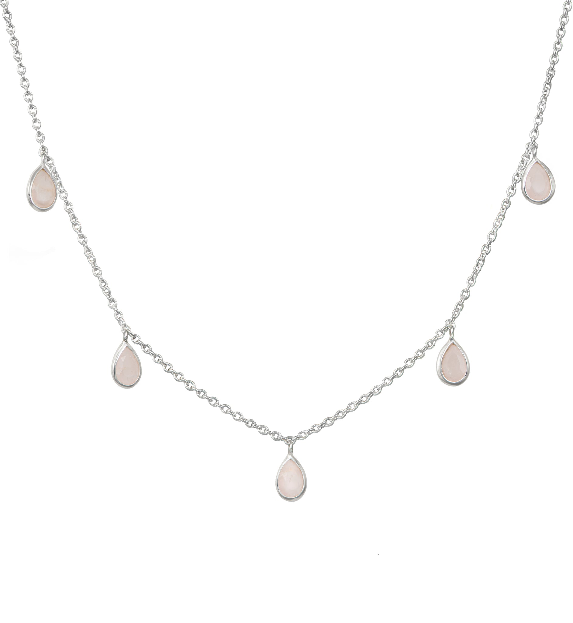 Five Teardrop Shaped Rose Quartz Gemstone Necklace in Sterling Silver