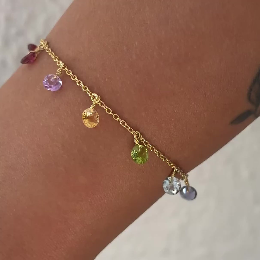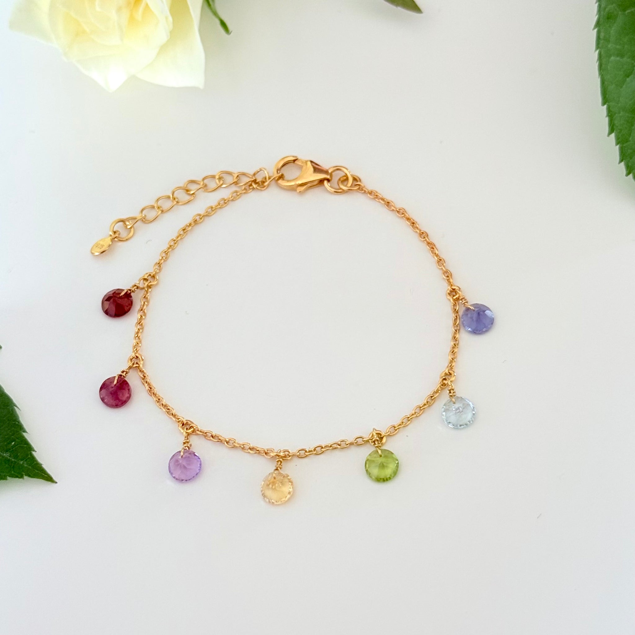 This vibrant and fine adjustable bracelet features seven delicate diamond-cut gemstones, inspired by the colours of the rainbow and linked to the chakras. The stones—garnet, tourmaline, amethyst, citrine, peridot, blue topaz, and iolite —are suspended like drops along a fine chain, blending colour and energy beautifully. With its bright rainbow colours and subtle sparkle, the design offers a touch of joyful energy and makes a thoughtful gift or a playful accent for everyday stacking.