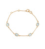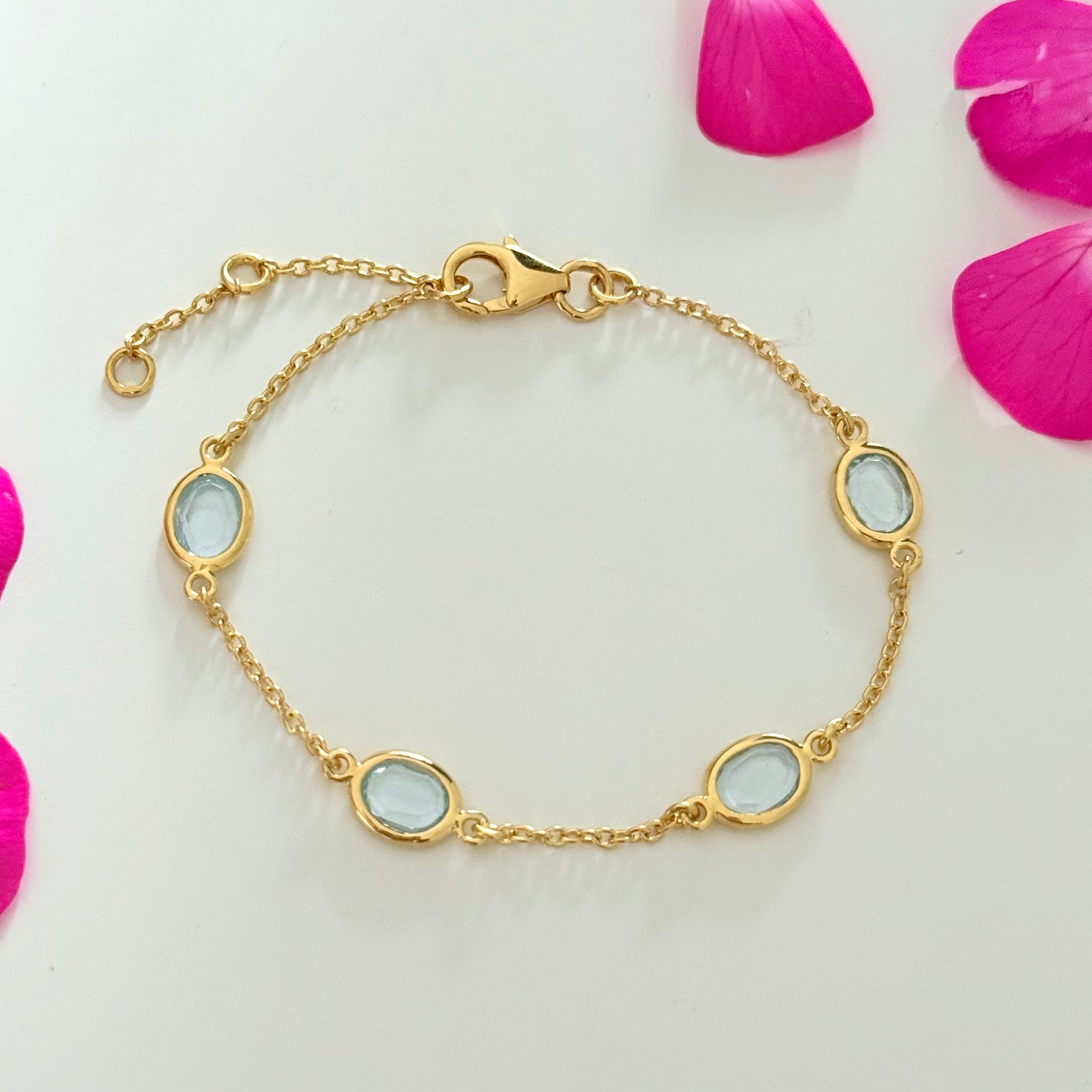 This bracelet features four oval-shaped, faceted blue topaz gemstones set in sleek 3 micron 18k gold plated sterling silver bezels spaced evenly 2cm apart. They are extended on a polished chain with three adjustable lengths, offering a refined balance of elegance and everyday comfort. Its clean design makes it versatile enough to wear alone or layer with other favourites.