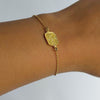 This 3micron 18k gold plated sterling silver bracelet features a delicate, fine chain that gracefully holds a subtly textured rectangular disc as its centrepiece. The disc is adorned with small sparkling cubic zirconia stones embedded in a scattered pattern, adding a touch of shimmer. The bracelet closes with a secure lobster clasp and has an adjustable length, offering both elegance and versatility for everyday wear or special occasions. Also available in silver.