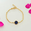 This bracelet is handcrafted with a natural Lapis Lazuli gemstone set in 3 micron thick 18k gold-plated sterling silver. The gemstone is secured in a sleek bezel, linked by an extendable chain of paper clip shaped links, offering both elegance and comfort for everyday wear. Its clean design and classic stone setting make it versatile enough to wear alone or layered with other pieces.